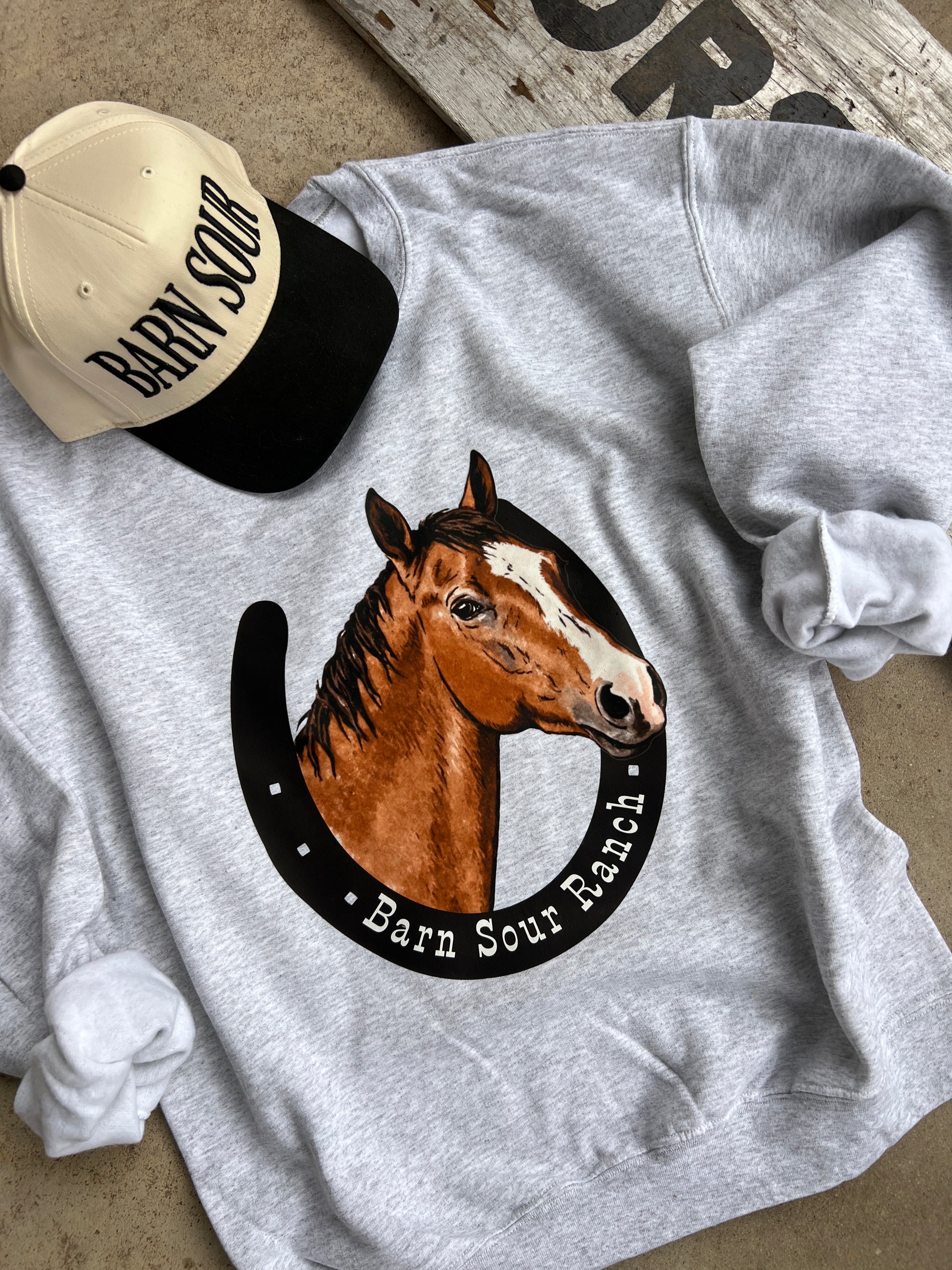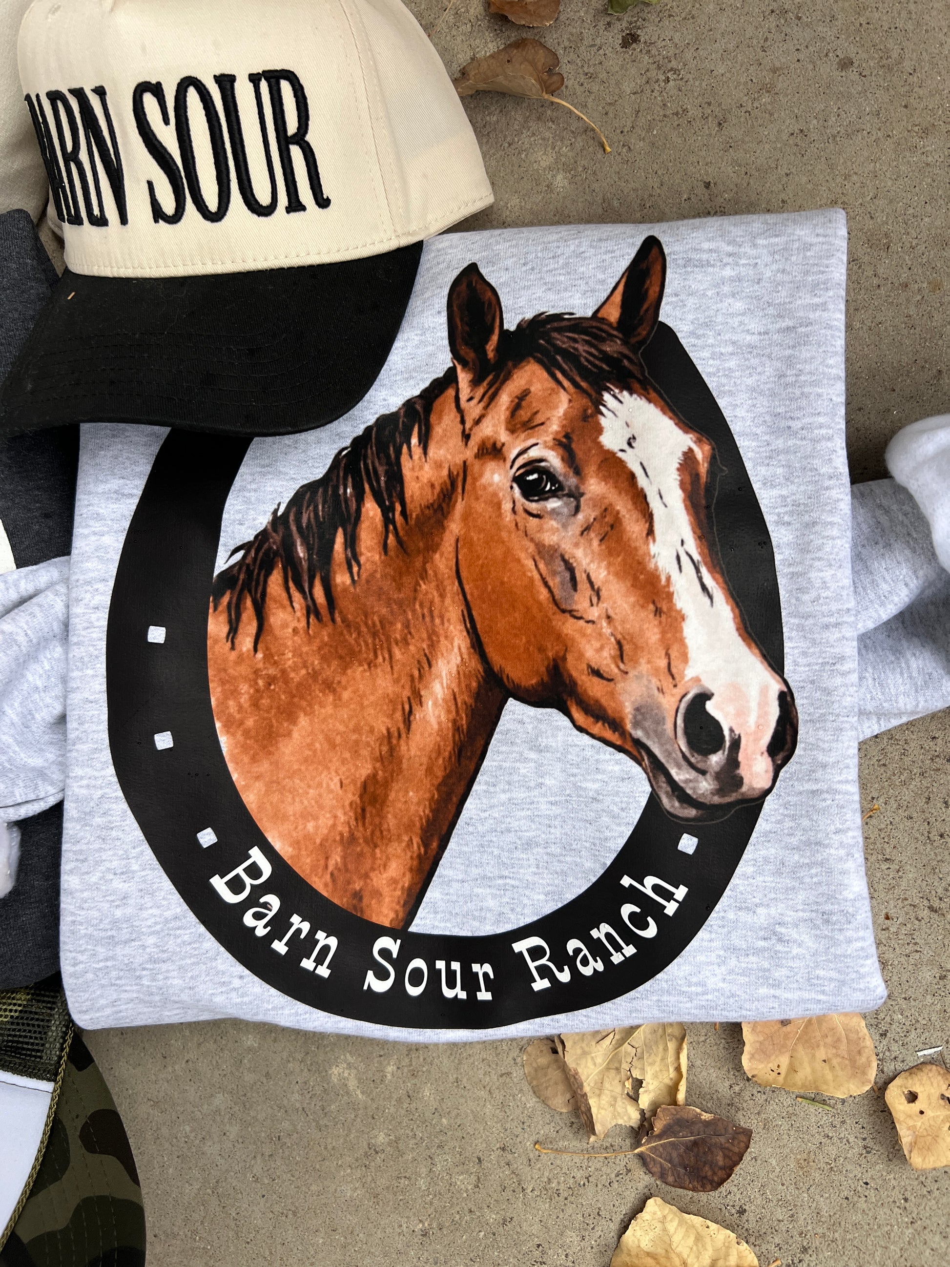 Featuring a graphic of our sweet Gypsy, the face of Barn Sour on this ash gray unisex crew neck is cozy, soft, and perfect for horse lovers, ranch enthusiasts, and anyone who wants a piece of our story.